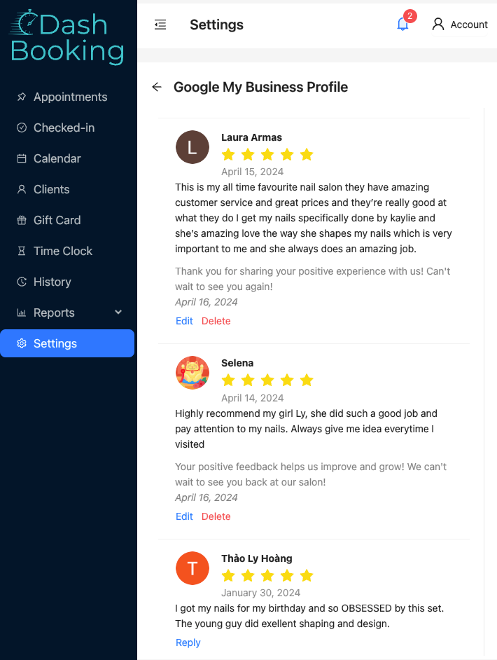 Seamlessly manage your Google Business Profile directly from your Dash Booking POS! You can now effortlessly handle all aspects of your Google presence right from your point-of-sale system. Here's what you can do: